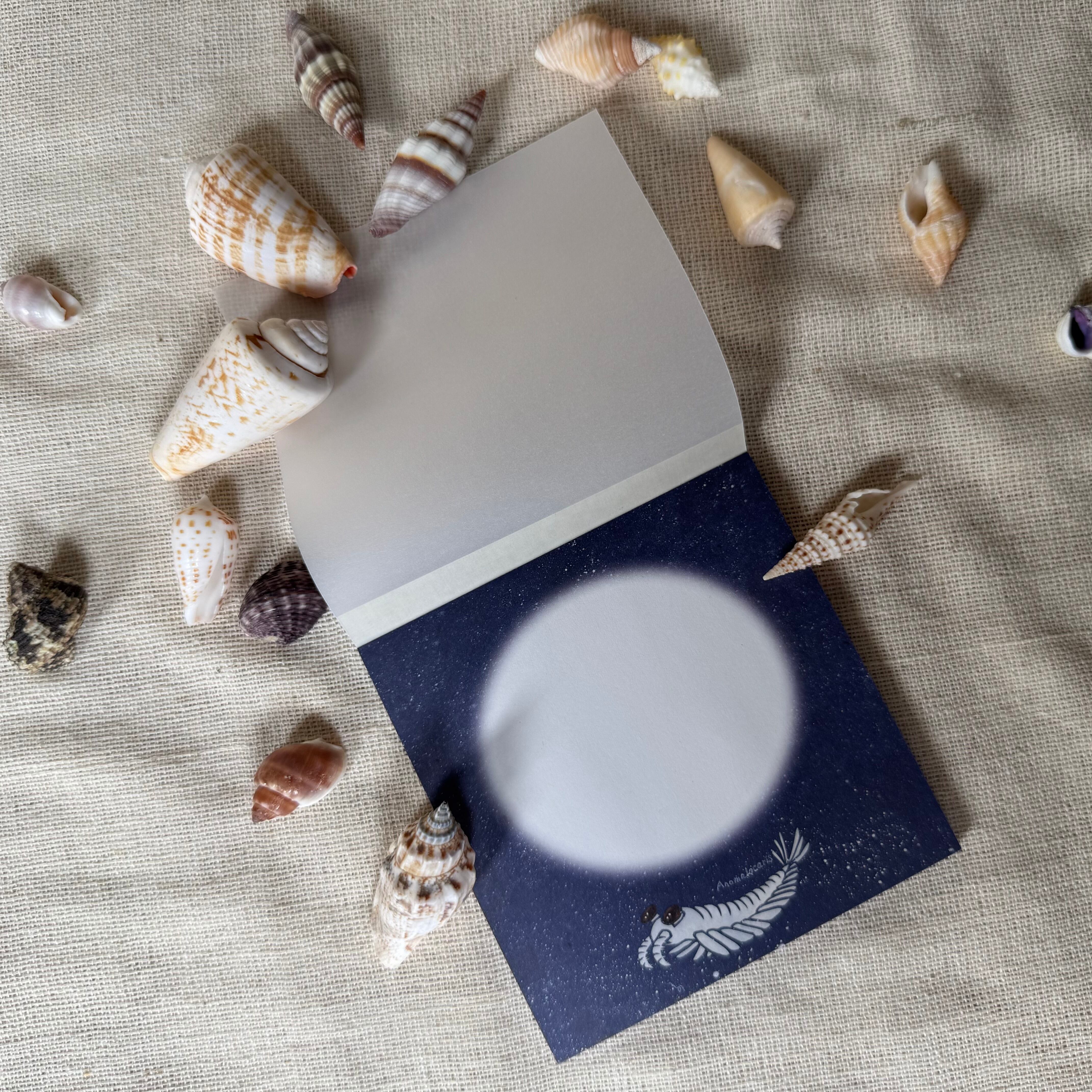 10㎝角の真四角のメモ帳です。 30枚入り。 半透明の表紙がついています。 貴方の隣にかわいいアノマロカリスを! 送料は何冊でも同額です。